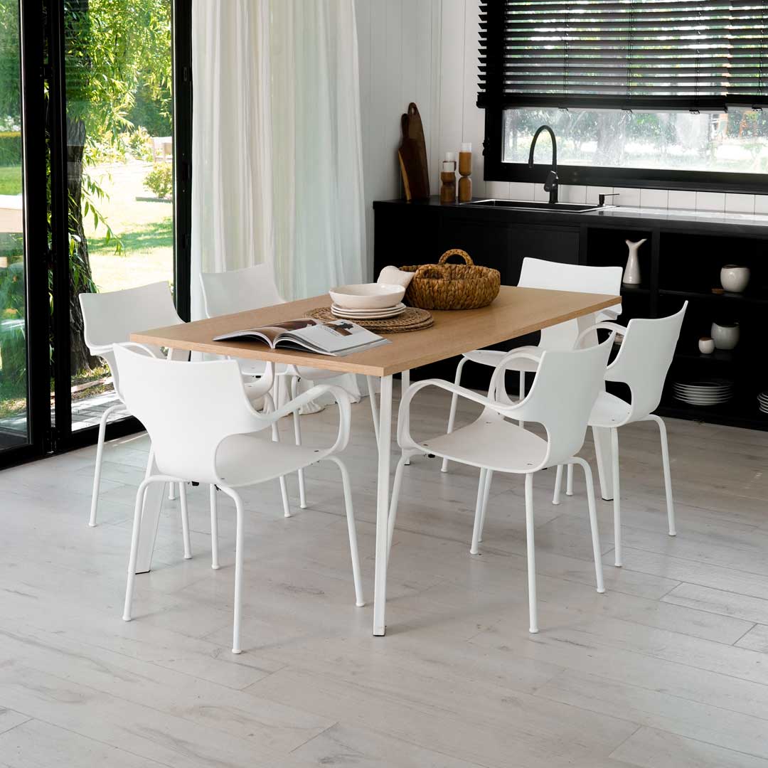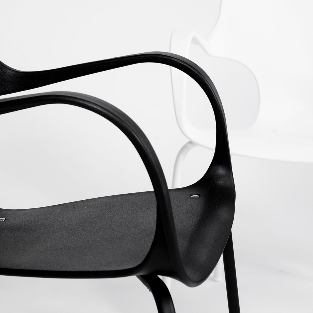 Silla fija monocasco en homopolímero con apoyabrazos integrados. Estructura con patas metálicas cromadas. Colores varios, consultar disponibilidad.